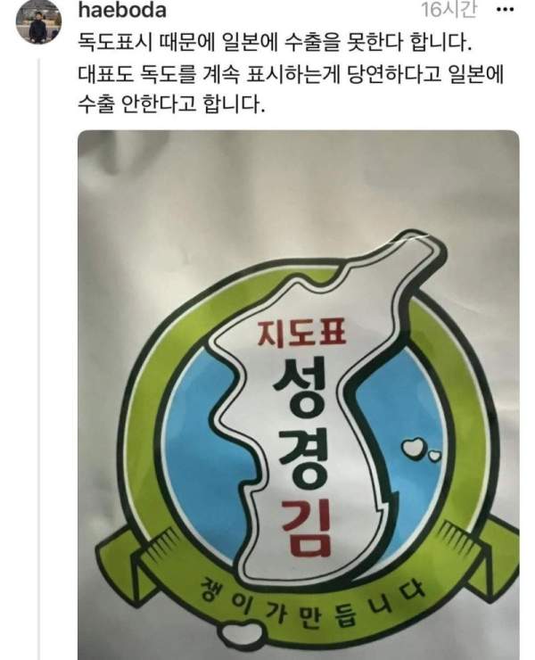 당연하게도 성경김이 일본에서도 판매가 되어야 할 텐데 절대 그곳에서는 살 수 없습니다. 성경김에는 독도가 포함된 한국 지도가 그려져 있기 때문입니다. 성경김은 일본에 판매하는 대신 대한민국 영토를 포기하는 일은 하지 않았습니다.
